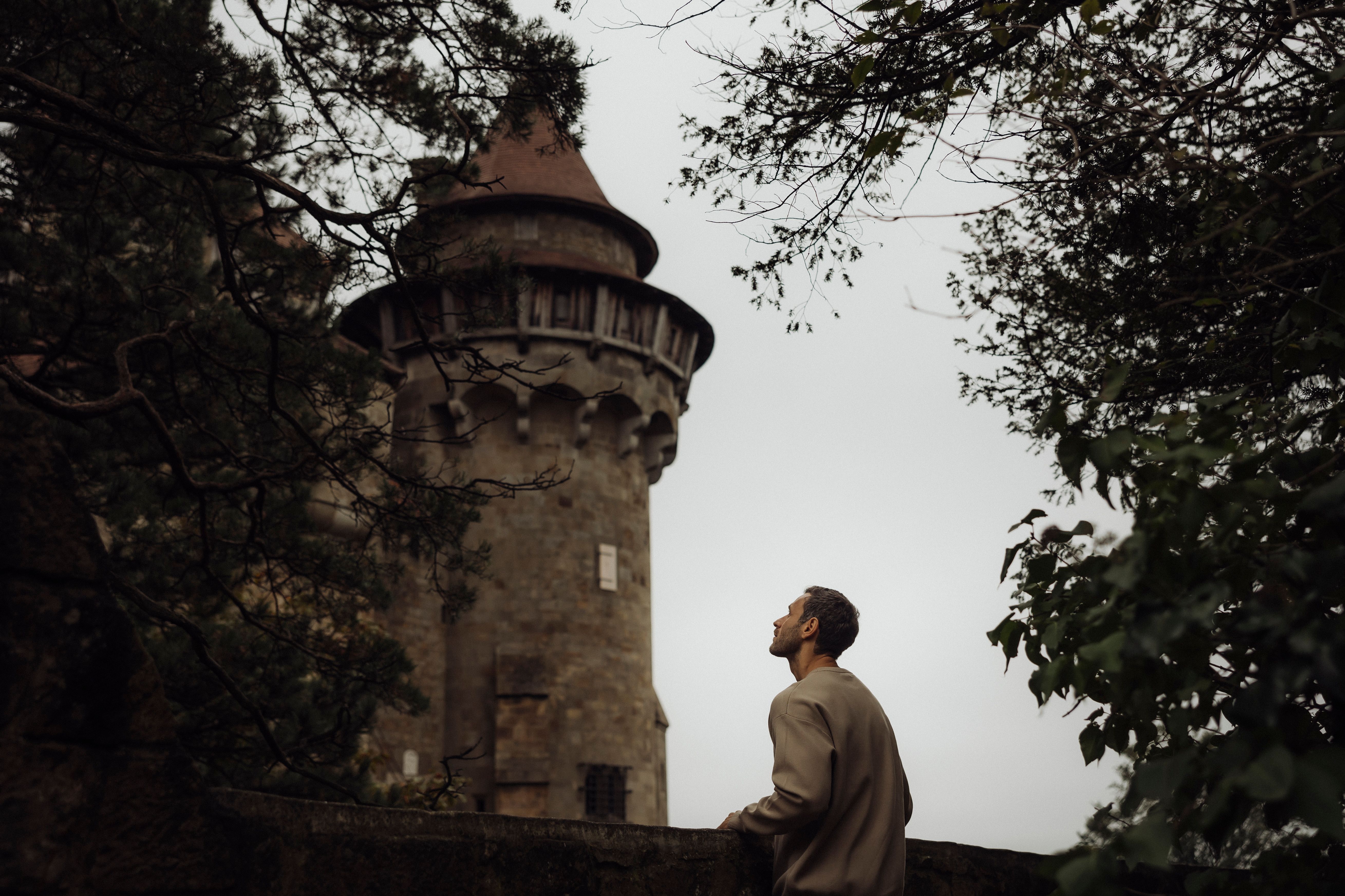 • Steinturm auf einem Hügel mit Treppe und grüner Umgebung.