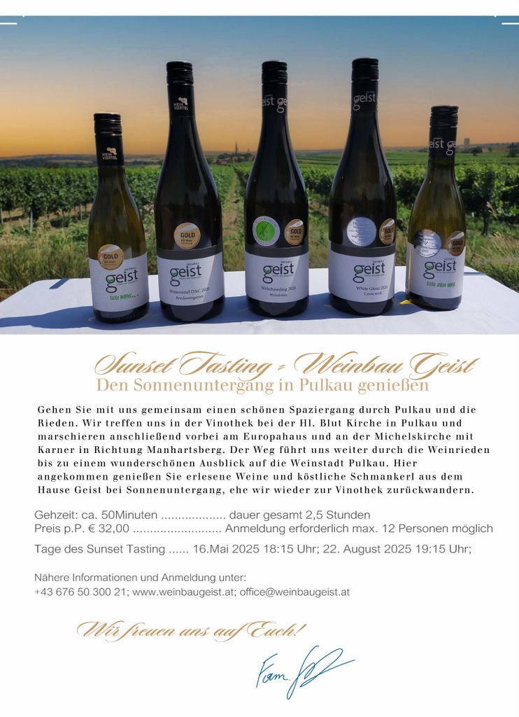 Die Hügel des Weinviertels sind immer ein schöner Anblick. Noch mehr sogar, wenn die Abendsonne sie in goldenes Licht taucht, alles ein wenig weicher zeichnet und man spürt, dass man auch einmal loslassen und manches weniger eng sehen darf. Der perfekte Augenblick, um ein gutes Glas Wein zu genießen. Oder noch besser, beim Sunset Tasting gleich mehrere Spitzenweine zu verkosten und dabei einen spektakulären Sonnenuntergang zu beobachten. Und wer könnte wohl die besten Spots dafür kennen, wenn nicht die Winzerinnen und Winzer selbst?