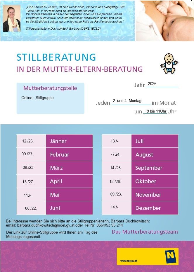 Eine Familie zu werden, ist eine wundervolle, intensive und einzigartige Zeit - eine Zeit, in der man auch an Grenzen stoßen kann. DGKS Barbara Duchkowitsch, mit langjähriger Erfahrung in der Stillberatung, spricht in Online-Stillberatungen Mut zu und möchte Ressourcen finden, um den Teilnehmerinnen die Möglichkeit zu geben, ganz in ihrer Rolle als Familie einzutauchen. Bei Interesse wenden Sie sich bitte an die Stillgruppenleiterin, Barbara Duchkowitsch. Email: barbara.duchkowitsch@noel.gv.at oder Tel.: 0664/5395214.