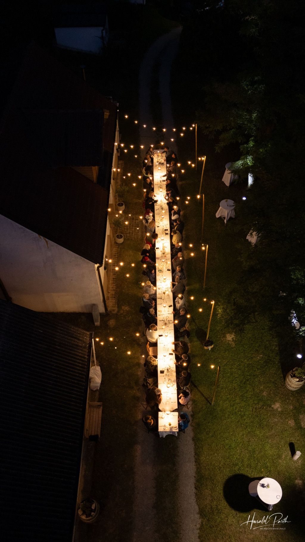 An der langen weißen Tafel wird gelacht und genossen, mit Blick auf die Weinberge und den atemberaubenden Sonnenuntergang.