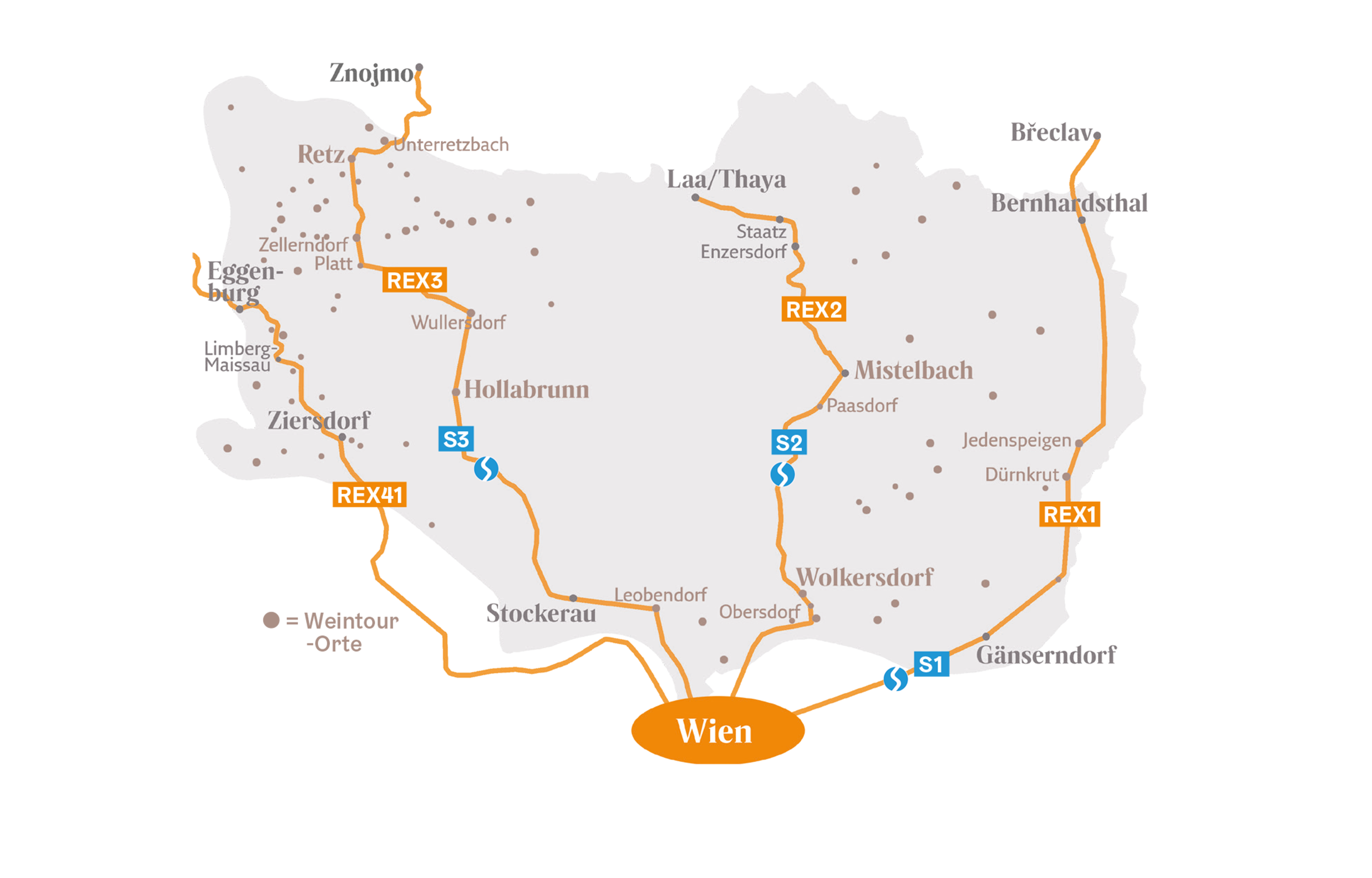 Einige Weinviertler Orte, in denen die Weintour Weinviertel stattfindet, werden regelmäßig mit Zügen oder Bussen aus Wien direkt angefahren, die Weingüter in diesen Orten sind von den Bahnhöfen bzw. Bus-Haltestellen in Fußdistanz erreichbar. Zu einer Vielzahl weiterer Weingüter im Umkreis dieser Orte kommen Sie nach Weiterfahrt zum Beispiel mit einem Taxi.